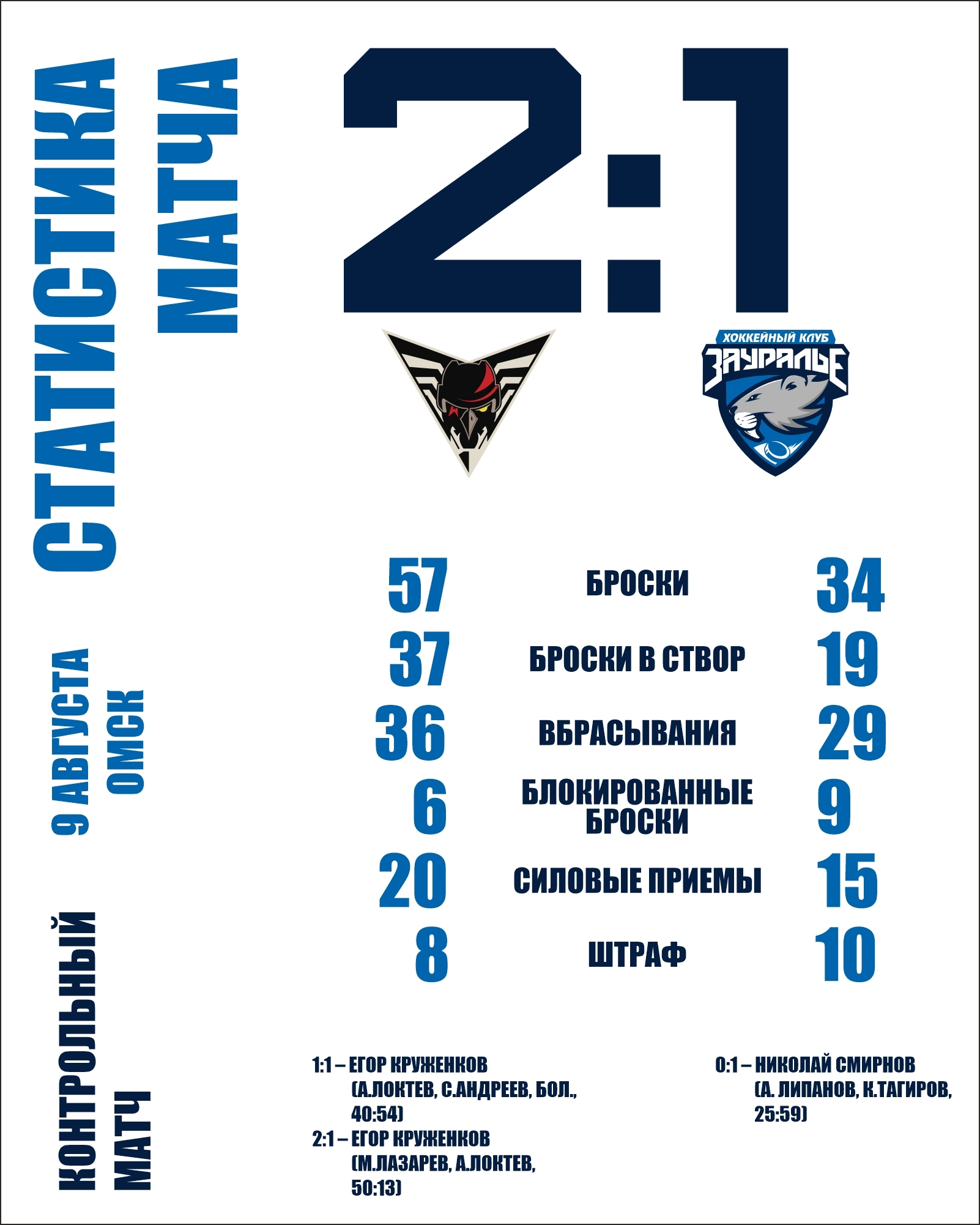 2:1 – Егор Круженков (М. Лазарев, А. Локтев, 50:13).